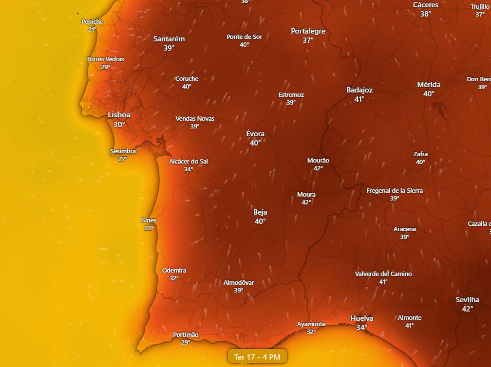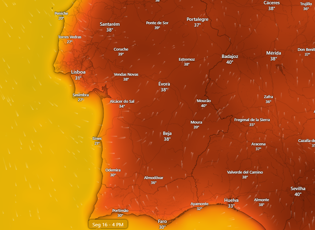 A partir de segunda-feira vamos entrar numa situação meteorológica típica de verão. A subida da dorsal Africana traz uma massa de ar quente e seco do Norte de África até ao nosso território fazendo os termómetros subirem bastante na próxima semana. Entre, pelo menos, segunda e quarta feira esperam-se temperatura máximas na ordem dos 40ºC nos locais habituais do Alentejo ( interior da região e vales do Sado e Guadiana) e também noites tropicais com mínimas acima dos 20ºC. Está também prevista a chegada de poeiras dos desertos do norte de África associadas ao episódio de calor: