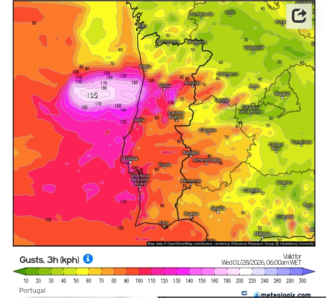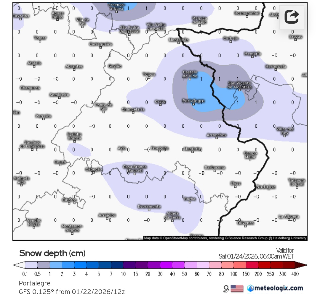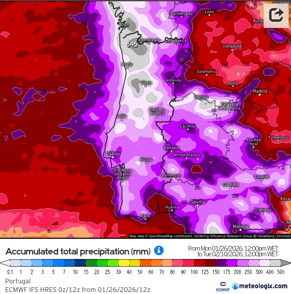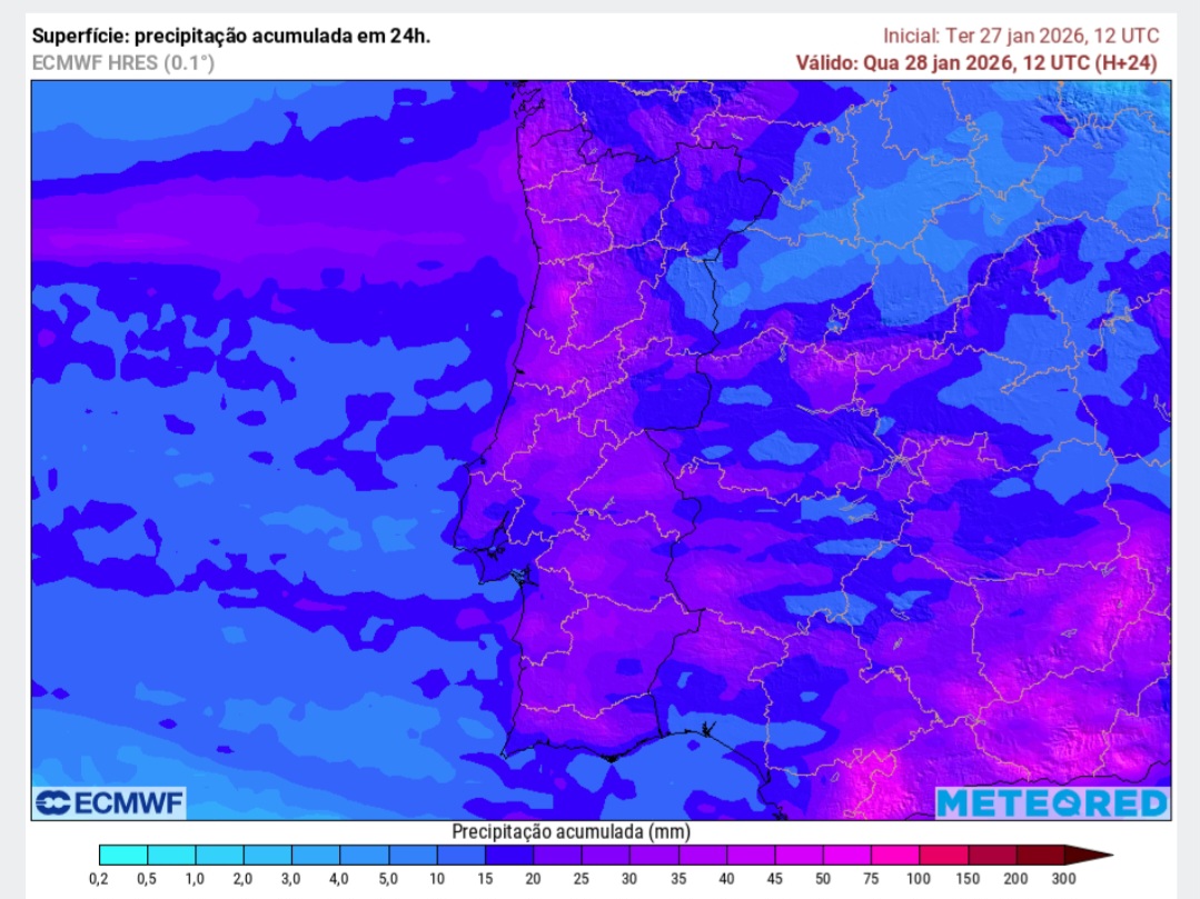 Uma nova depressão vai condicionar o estado do tempo a partir desta noite com o regresso da chuva intensa. Prevê-se que o pico de intensidade da chuva forte no Alentejo seja entre as 03h e as 6h da madrugada desta segunda-feira. Os acumulados previstos vão variar entre os 15mm (zonas a azul) e os 75mm (zonas a rosa):
